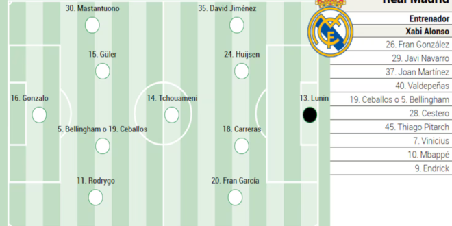 Entre bajas y fatigas. Así, toca hacer un once; un equipo para debutar en Copa del Rey. Con −prácticamente− lo que hay. Y muchos canteranos. Courtois, Rüdiger, Asencio y Valverde han sido las últimas bajas. Todos por cosas menores −Thibaut, descanso−, pero ausentes en El Prado. La alineación, por ende, apunta a una absolutamente inédita. Con Gonzalo en punta, dos laterales izquierdos y dos canteranos llamando a la puerta. Penúltima batalla de Xabi en 2025.